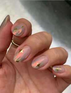 10. Projekt gwiazdy to trend inspirowany niebem, który dodaje odrobiny magii i przepychu. Netralny manicure z perłowym brokatem i złotymi gwiazdami: