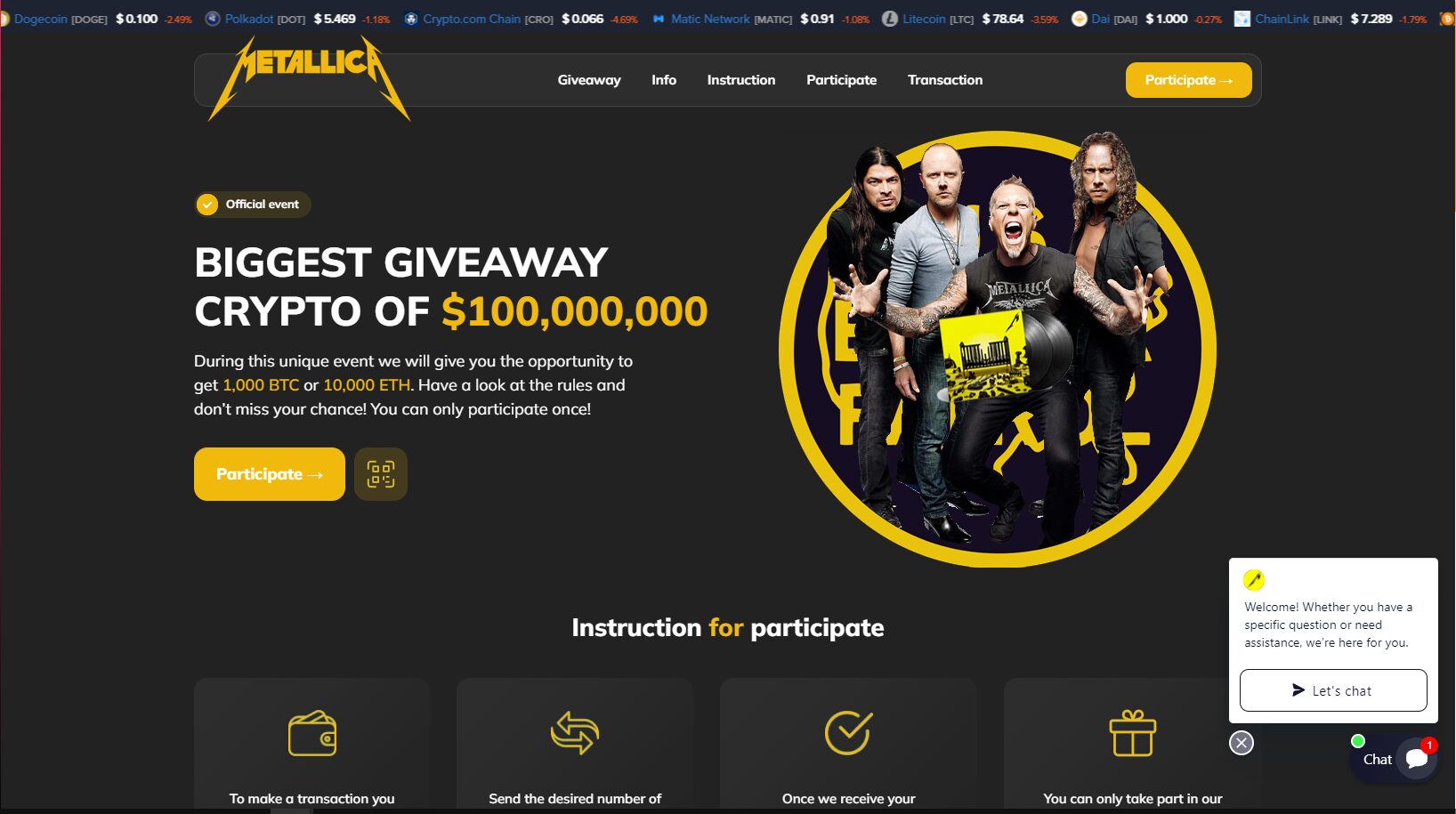 Po włączeniu transmisji obejrzeć można było dość wiarygodnie wyglądające nagrania wywiadów i wypowiedzi członków zespołu umiejętnie imitujące autentyczną rozmowę na żywo. Zastanawiająca jednak była zawartość czatu, a właściwie jej brak. Zablokowana została możliwość komentowania dla wszystkich widzów, a jedyne wiadomości to przypięte przez autora transmisji linki do konkursu oraz jego zasady. Zespół z okazji swojej światowej trasy koncertowej miał zorganizować giveaway krypowalut. Po wysłaniu 0.1 Bitcoina lub jednego Ethereum uczestnik konkursu miał dostać podwojenie swojej wpłaty. Aktualnie wartość tych kryptowalut to 5 604 zł za Ethereum i 76 041 zł za Bitcoin.