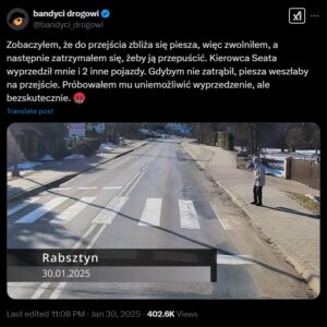 Czasem można odnieść wrażenie, że niebezpieczne czy frustrujące sytuacje zdarzają się na polskich drogach codziennie. Ja także w życiu prywatnym jestem jednocześnie kierowcą, który zauważa bawiących się w Tour de Pologne na środku ulicy rowerzystów, pomimo znajdującej się obok ścieżki rowerowej, pieszym, którego na przejściu nie zauważył niedowidzący 97- letni emeryt, który prawo jazdy zdawał jeszcze pewnie w Stalinogrodzie oraz rowerzystą, który dziesiątki razy musiał hamować przed bezmyślnie wchodzącym na ścieżkę rowerową pieszym, który stwierdził, że jest to idealny moment na sprawdzenie strony głównej TikToka.